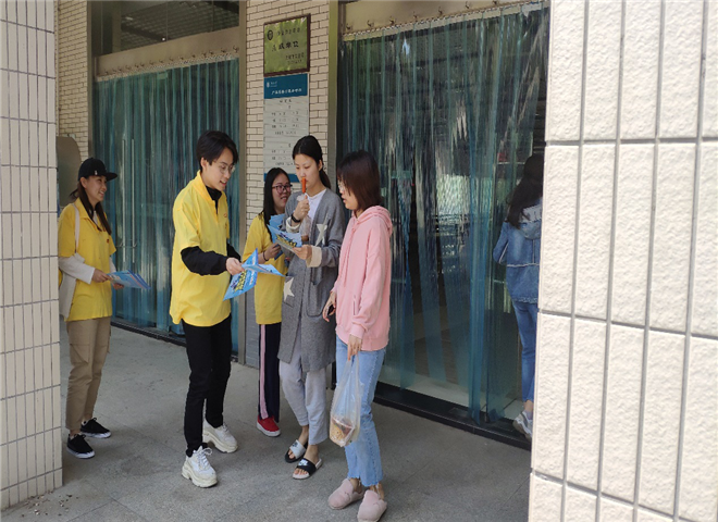 志愿者团员进宿舍发放并讲解“扫黑除恶”宣传单