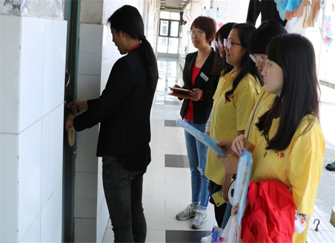 志愿者配合站长老师进行宿舍卫生督查、发放“扫黑除恶”宣传单
