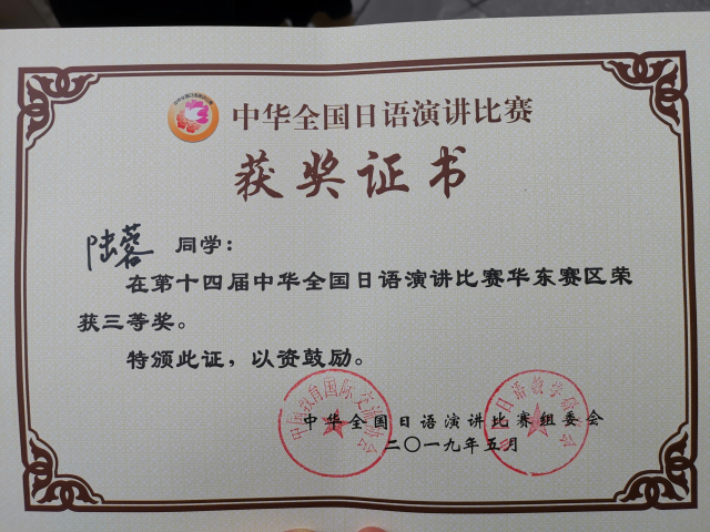 我院日语系学子荣获“第十四届中华全国日语演讲比赛华东赛区”三等奖