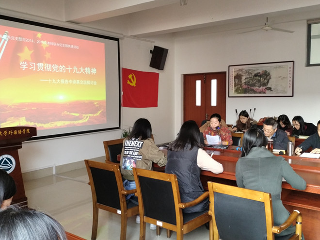 本次政治理论学习,不仅是专业翻译领域的探讨交流会,更是共建支部对十九大精神的再次集中学习。会上师生在充分肯定了报告译文的专业性、准确性和中国特色外,对于学习外语不仅能够传播弘扬中华文化,让世界更多人认同中国特色、认同中国价值,同时使中国走向世界舞台的中央充满了信心,感受到自身肩负着民族和国家赋予的重大历史使命。