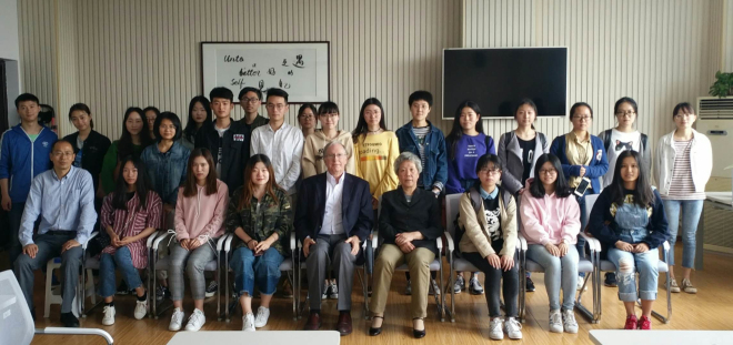 最后,在座的同学们纷纷踊跃地用英语与Shoemaker教授交流,对于人生、理想、未来、就业各抒己见,针对自己学习中的迷惘提出了一系列问题,教授都给予了中肯的回答。Shoemaker教授认为,英语专业的同学不应局限于某一领域,大可以放眼世界,挑战自我,多学习、了解更多更广阔的领域,在工作上多尝试,发现自己的兴趣点,方能燃起热情。对于抗压抗挫,Shoemaker教授也从自己的故事出发诙谐幽默地告诉学生要多多尝试,适当转换,选择自己喜欢的领域并持之以恒是一件幸福的事。最后,同学们还询问了Shoemaker教授所研究的食品科学领域的研究发现,同学们受益匪浅。