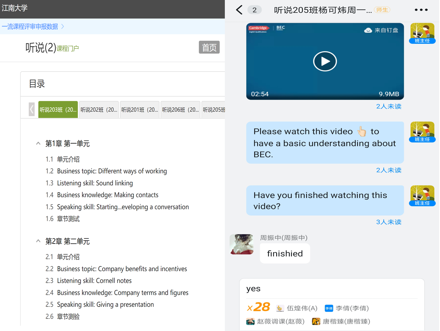 时间紧、任务重。培训结束当天,大学英语部的教师们就组建了在线授课班级群228个。为了保证一万多名学生顺利入群,教师、教务、学工协同联动,教师每日更新未入群学生数量及名单,教务及学工通知到学生个人,许多老师还主动通过江南大学企业微信一个个寻找未入群的学生。通过三方的共同努力,除了少量学生因特殊原因外,均已进入班级群。9月6日上午,大学英语线上教学正式开始,教学工作进展顺利,教学效果良好!