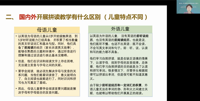 美国杰克逊州立大学教育学博士、集美大学leyu(中国)教授、外语教师教育与发展研究所所长张海燕教授的话题为《小学英语教学中语音意识的培养》。她首先介绍了语音意识的定义及其构成要素,强调了它在自然拼读和语言学习中的重要性。通过具体实例的拼读教学演示辨析了一系列语音学术语。同时,她分享了美国课堂中提高学生语音意识的方法,为我国教师开展自然拼读教学提供了启示。