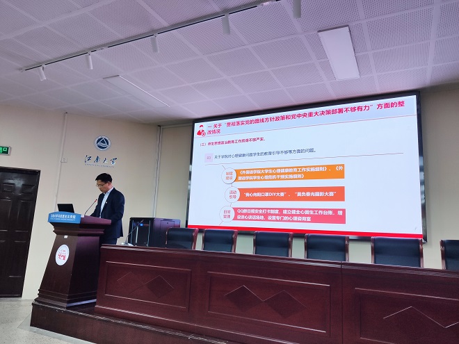首先由史志洪向全院教职工汇报学院巡察整改的落实情况。报告分三部分汇报了学院履行整改主体责任情况,整改任务落实情况和下一步整改工作方向。学院党委高度重视巡察整改工作,整改期间,学院巡察工作领导小组分析原因,细化整改任务,明确整改举措,研究部署解决整改工作中的重点难点问题,同时明确班子成员分工,夯实整改责任,对整改意见逐条逐项抓落实,确保巡察反馈意见中的每一个问题都得到整改。之后开展师生满意度测评,教职工填写巡察整改情况调查表。