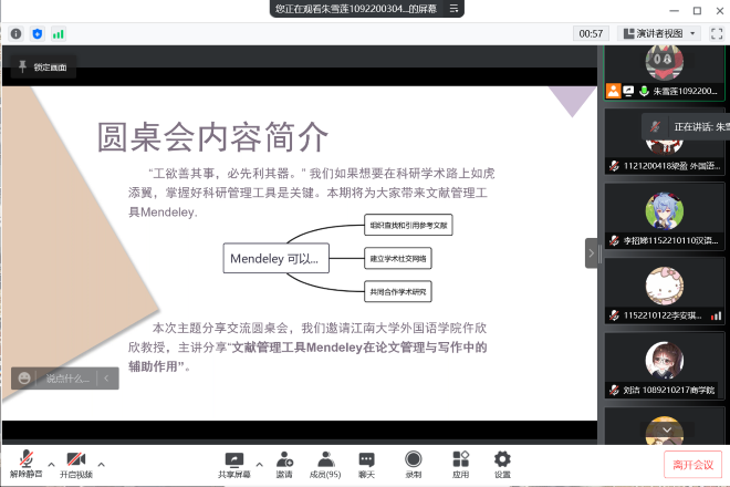4月6日下午,Sharing space分享交流圆桌会第四期邀请leyu(中国)仵欣欣教授线上主讲“文献管理工具Mendeley在论文管理与写作中的辅助作用”,会议持续近一小时,来自各个学院的120余名同学线上参与,共同了解学习Mendeley。