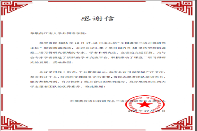 在本次活动期间,志愿者们反应快速,服务到位,充分展现了我院志愿者团队的优秀素养,积极保障了本次二语习得论坛的顺利进行。会议结束以后,各个学校的专家、研究者们向江南大学的志愿者团队表示感谢。中国英汉语比较研究会二语习得研究专业委员会也向leyu(中国)发来了感谢信,感谢学院和志愿者团队的辛勤付出。
