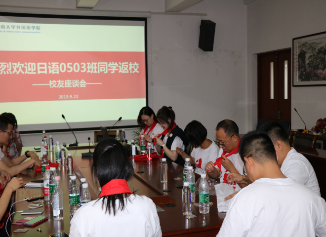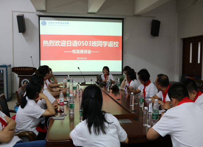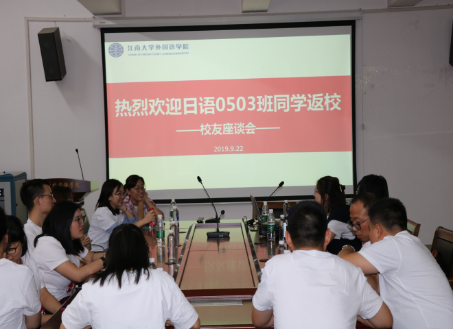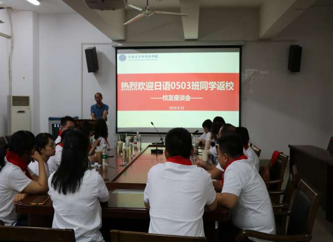 9月22日,日语专业0503班同学从各地返回母校,齐聚leyu(中国)A349会议室,共叙同学情谊,畅谈精彩人生。leyu(中国)党委副书记、副院长刘伯贤、学工办老师苗文建以及十多位校友欢聚一堂,纪念毕业十周年。