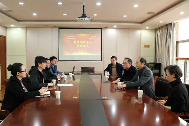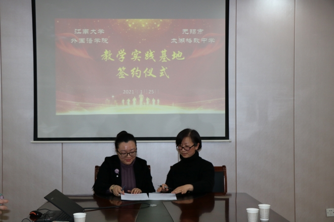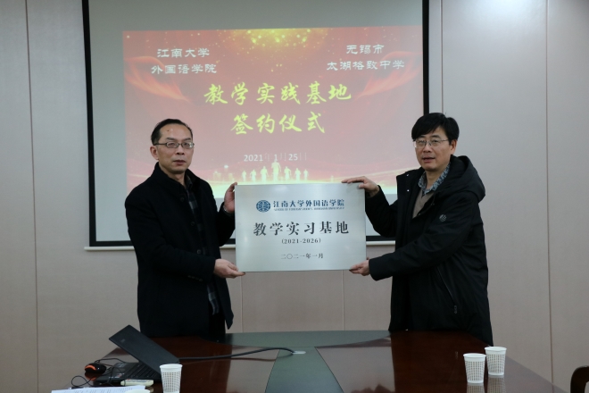2021年1月25日下午,我院与无锡市太湖格致中学共建教学实习基地暨授牌仪式在无锡市太湖格致中学三楼会议室举行。学院院长方文开、党委副书记刘伯贤、副院长顾琦一、副院长谢竞贤及学院社会服务部程方老师、无锡市太湖格致中学校长惠晓虹、副校长蒋茂元、副校长余志明、副校长王万萌参加了签约仪式。