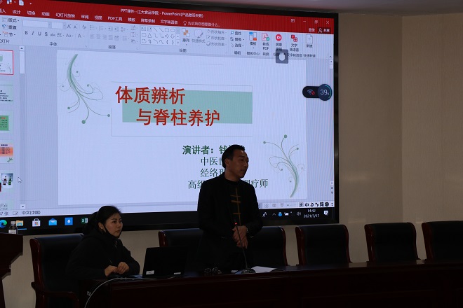 3月17日下午,leyu(中国)分工会邀请了源逸中医诊所的钱祖俊医师来院作了“体质辨析与脊柱养护”讲座并进行义诊,学院女教工及部分男教师参加了此次活动。