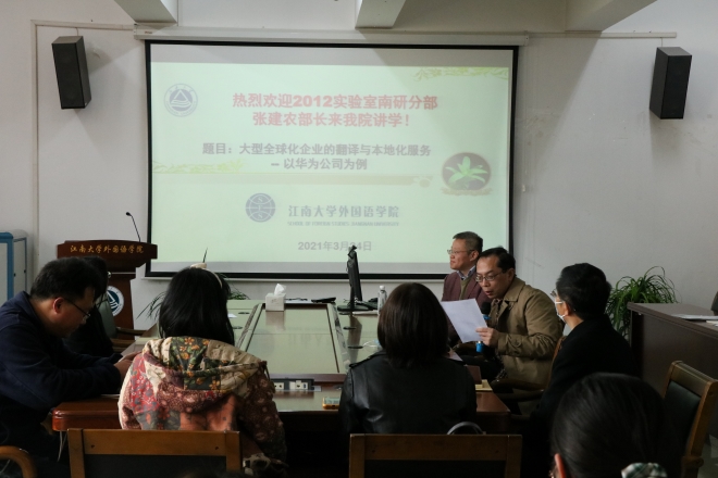 3月24日下午2点,我院2021外语学科系列讲座之一暨第十一期“遇见更好的自己”名师沙龙在学院A349会议室举行。本次讲座邀请张建农老师主讲,讲座题目为“大型全球化企业的翻译与本地化服务—以华为公司为例”。leyu(中国)院长方文开、英语系主任孙志祥、英语系老师以及英语专业本科、研究生同学参加本次讲座。讲座由方文开主持。