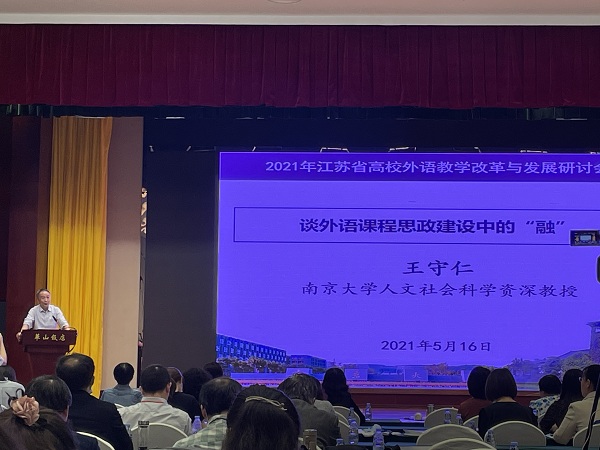 由江苏省高等学校外国语教学研究会与高等教育出版社主办的2021年江苏省高校外语教学改革与发展研讨会于5.15-16日在南京召开。本次研讨会以“大学外语教学中的课程思政融入”为主线,分别针对本科院校与高职院校的大学外语教学中如何推进课程思政教学改革进行了深入研讨。大会采用了专家发言、教师分享与互动交流的方式进行。我院朱义华、张效国与王伟炜老师参加了会议学习与研讨。