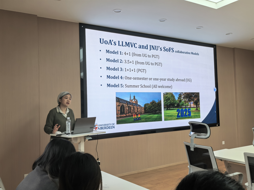 朱珠介绍了阿伯丁大学的办学历史、师资队伍、学术影响等情况,在语言文化、人文社科领域积淀深厚,是一所办学历史悠久、学术影响力强的高校。随后,她着重从课程体系设置、学科布局、培养方向等方面展示了音乐与视觉文化学院的基本情况。她表示,音乐与视觉文化学院的课程涵盖从基础语言教学到高阶文化研究,课程体系覆盖多语种、多方向,且师资团队兼具学术深度与行业经验,能为学生提供理论实践双轨培养。